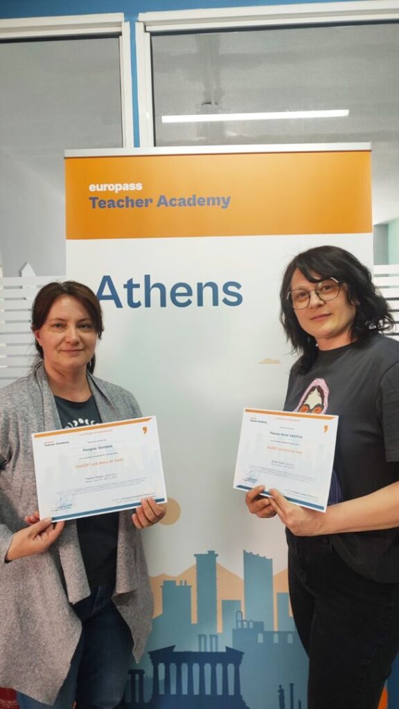 U sklopu Erasmus+ akreditacije i cilja usmjerenog na podizanje čitalačke pismenosti kroz nove metode poučavanja, učiteljice Valentina Posavec Kovač i Danijela Pongrac sudjelovale su na šestodnevnom tečaju “Basic AI Tools and ChatGPT” u Ateni. Edukacija u organizaciji Europass Teacher Academy okupila je prosvjetne radnike iz cijele Europe s jednim ciljem: integracijom umjetne inteligencije (AI) u suvremenu nastavu. Edukaciju je stručno vodila Vasiliki Plati, vrsna stručnjakinja čiji je inovativan pristup polaznicima pružio ne samo teorijsko znanje, već i konkretne alate za transformaciju učionica. Svojim je bogatim iskustvom i dinamičnim stilom poučavanja inspirirala sudionike da hrabro zakorače u novu digitalnu eru obrazovanja.