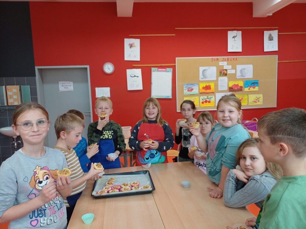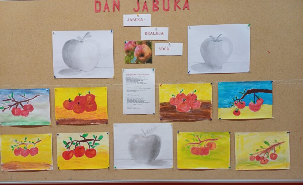 Uredili su pano posvećenim jabuci, a zatim su učenici 2. razreda zajedno s učiteljicom napravili sok od jabuka, zamijesili tijesto, ogulili i naribali jabuke, napravili pitu i košarice punjene jabukama te sve to ispekli uz pomoć naše kuharice. Nakon kušanja svega što su napravili, složili su se da je jabuka s pravom nazvana KRALJICOM VOĆA!