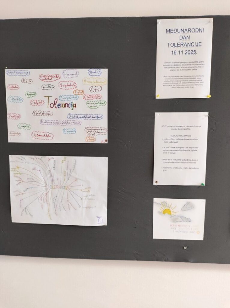 UNESCO je proglašenjem Dana tolerancije 1996. godine skrenuo pažnju na brojne međunarodne akte koji se tiču ljudskih prava. Dan tolerancije obilježili smo radionicama na satovima razrednika u 7. i 8. razredima u matičnoj školi i PŠ Salinovec. Učenici su se podsjetili da tolerancija treba biti nešto u čijem oblikovanju svatko od nas može sudjelovati. Zaključili smo da učeći o drugima postajemo tolerantni prema onome što je različito. Naši sedmaši i osmaši napravili su plakate s pojmovima koji su vezani uz toleranciju ili stvarali zajedničku razrednu priču.
