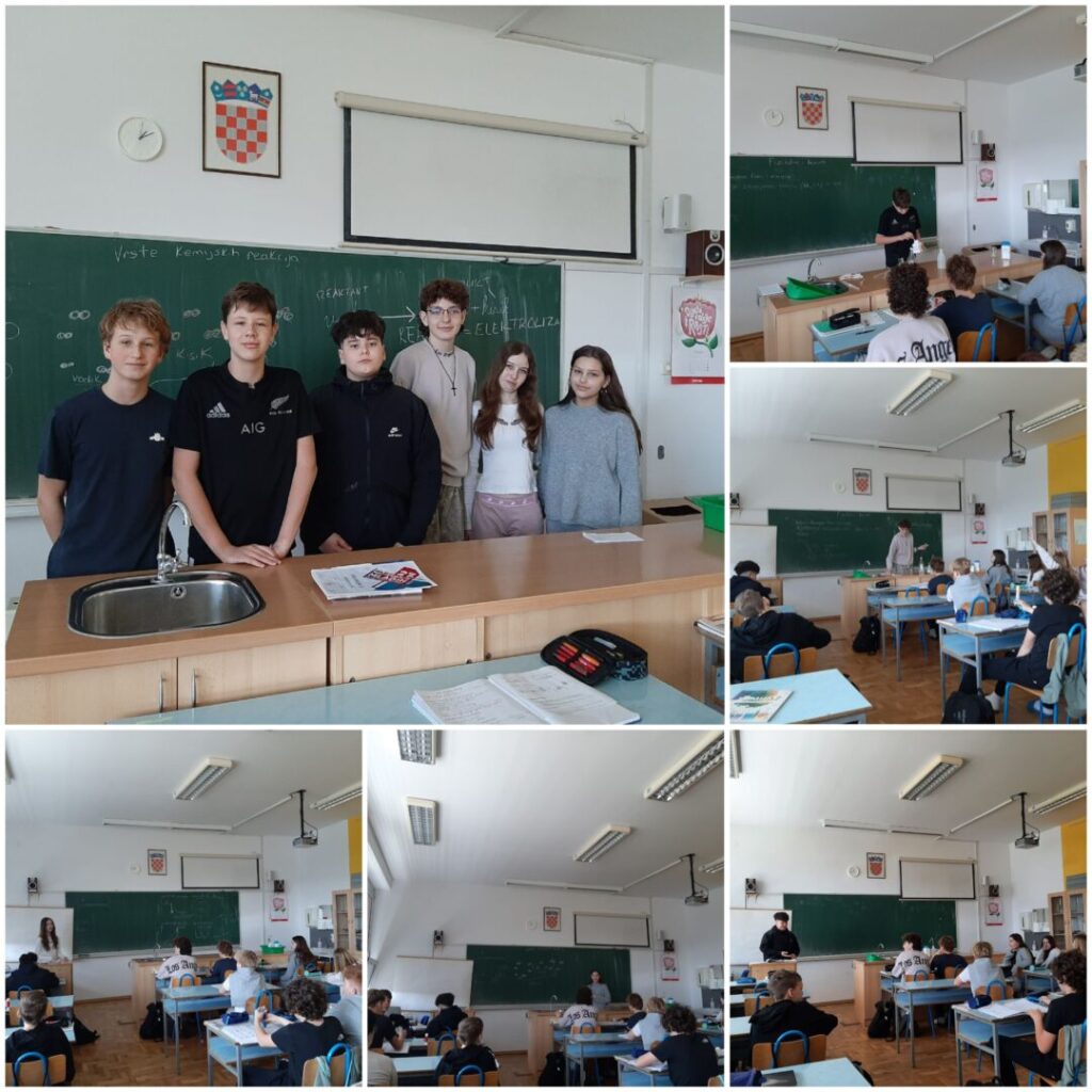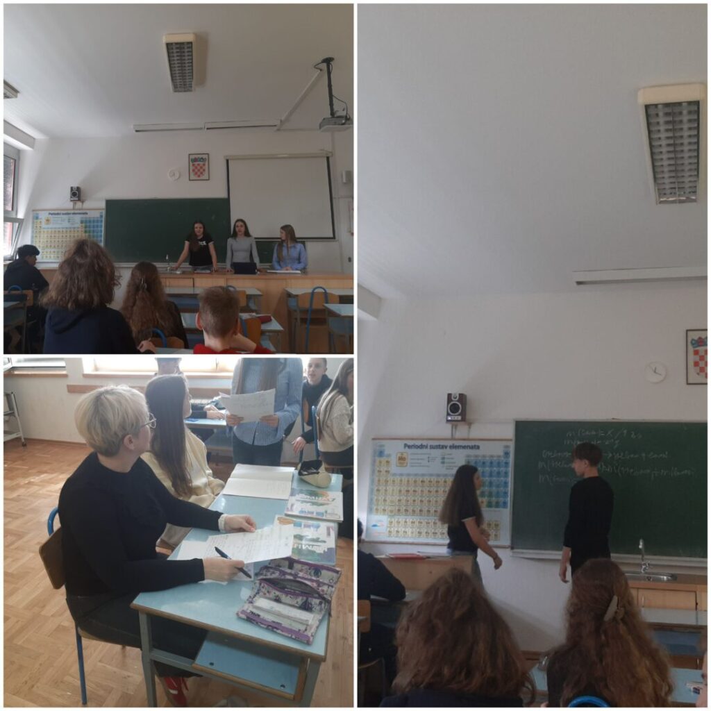 Na nastavi kemije učiteljicu su zamijenili učenici u 7. c razredu: Patrik Harjač, Luka Pretković, Erald Iseni, Maksim Putar, Zrinka Galić i Nika Lončar, te u 7. b razredu učenice Tena Grđan, Erika Klampfl i Zara Kočet. Tijekom nastave demonstrirali su pokuse ostalim učenicima uz njihovo aktivno sudjelovanje u radu, objašnjavali nove sadržaje te ponavljali obrađeno gradivo. Učenici su pokazali veliko znanje, odgovornost i samostalnost u poučavanju, a svojim su pristupom potaknuli znatiželju i aktivno sudjelovanje ostalih učenika.